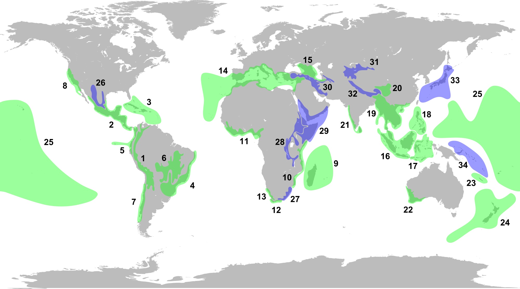 Introduced in 1988, the concept of biodiversity hotspot must be considered when talking about conservation. What are these hotspots? Areas which bear at least 1500 endemic plant species (species that aren’t found elsewhere) and which have lost at least 70% of their original area. 34 hotspots are actually recognized (see the map).