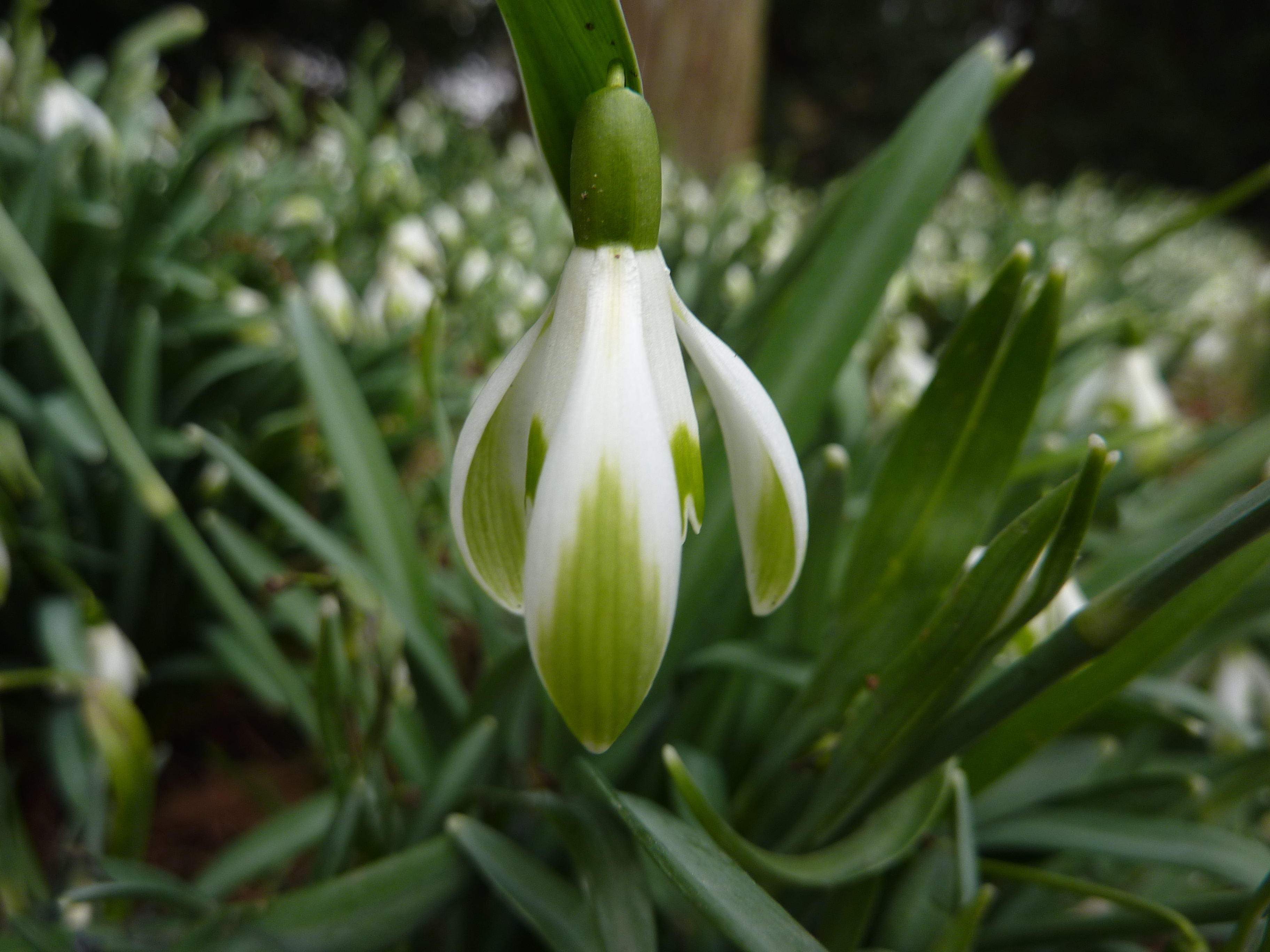 La flore hivernale nous offre ses jolis atouts : des perces-neiges (ici une variété aux extrémités des tépales verts, Galanthus nivalis var. scharlockii) au Cornouiller mâle (Cornus mas) qui porte ses fleurs sur des rameaux nus…
