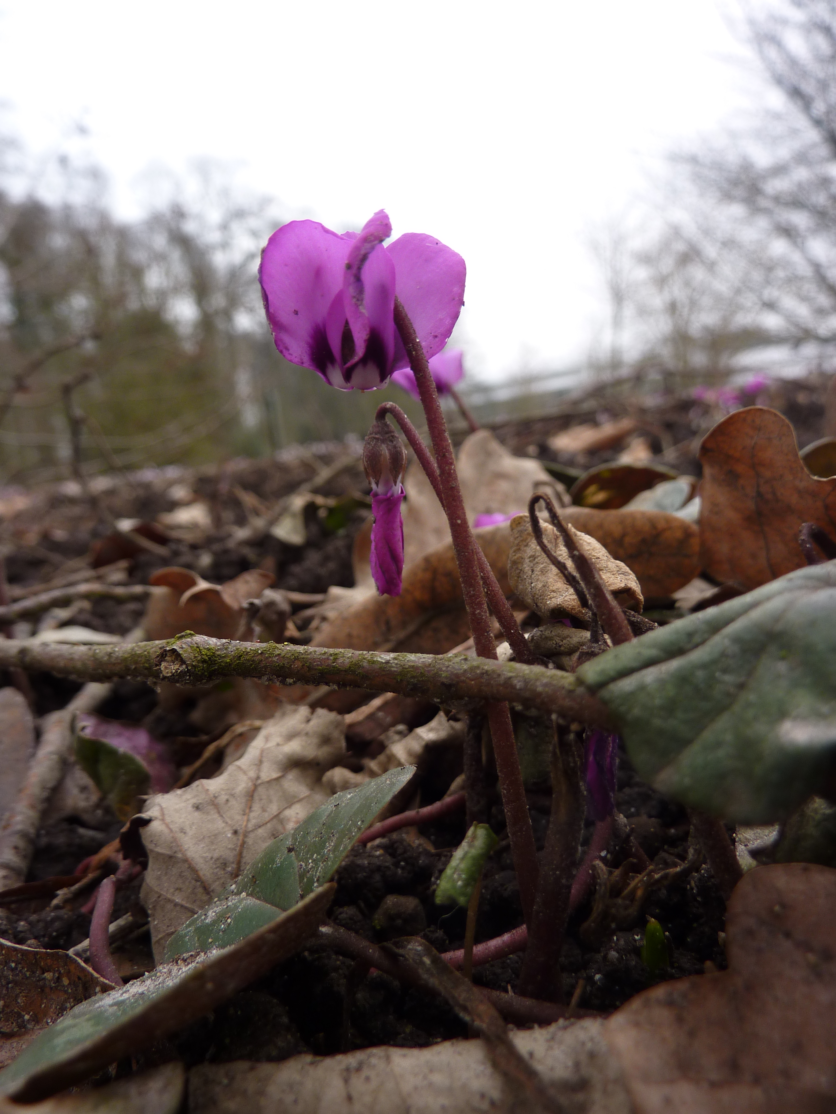 en passant par les Hamamélis (joliment dénommés “noisetier de sorcière” en anglais! Ici in cultivar aux fleurs ocre, Hamamelis intermedia ‘Orange Beauty’) et les cyclamens qui forment de jolis tapis blanc et rose.