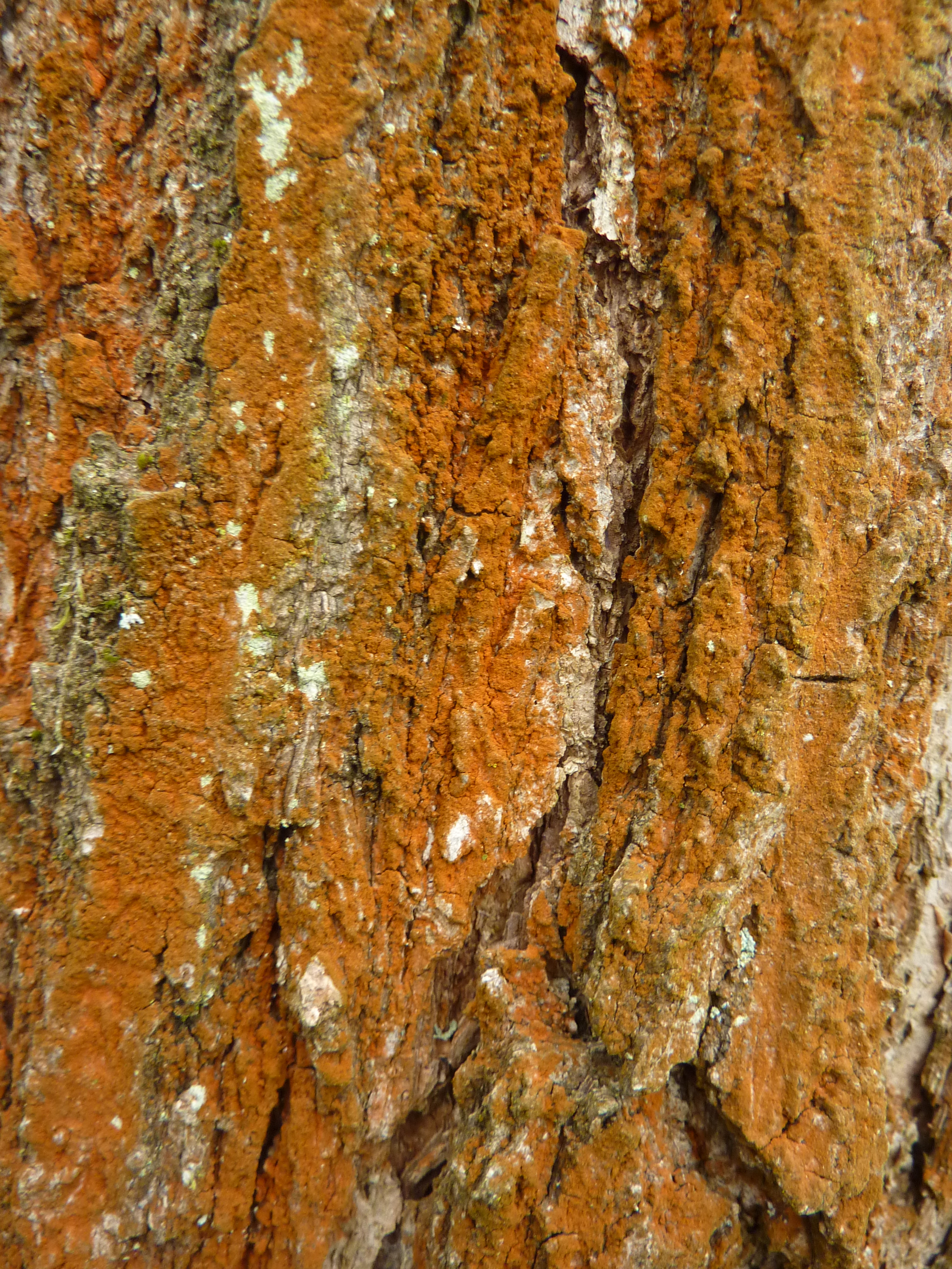 L’oeil ne peut qu’être attiré par la couleur orangée de ce tronc…mais qu’est-ce donc? Un lichen? Un champignon? Non, c’est une algue du genre Trentepohlia qui peut vivre ou pas en symbiose avec des lichens, sur des troncs d’arbre.