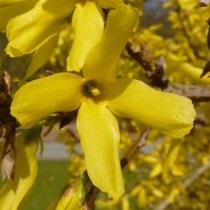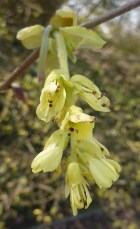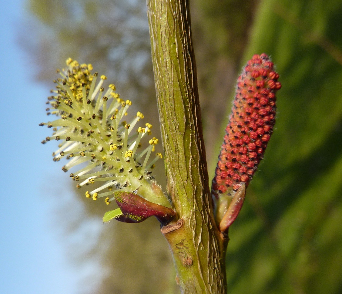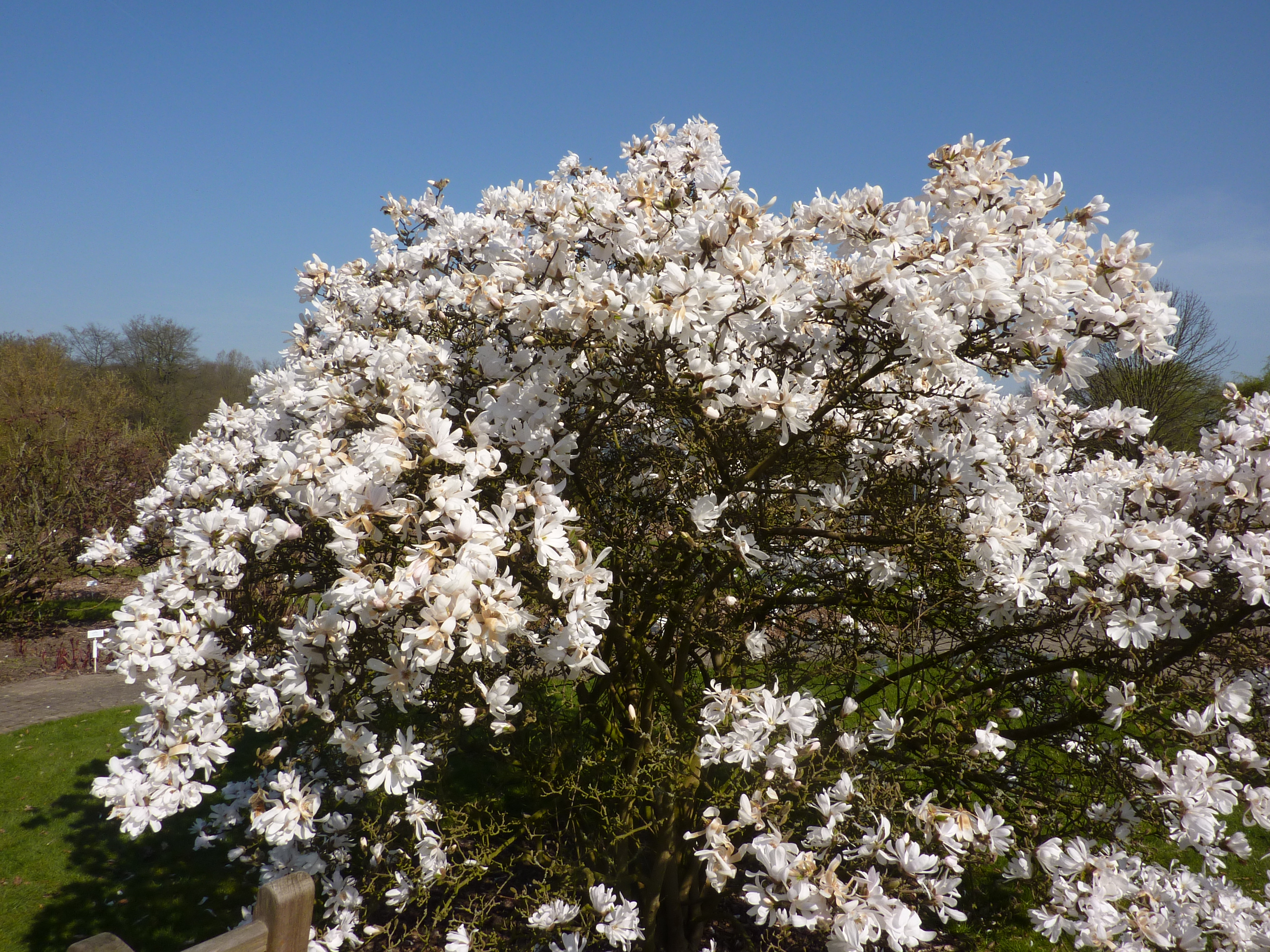 Un peu plus loin, c’est un Corylopsis à épis (Corylopsis spicata) qui déploie ses fleurs jaune citron, mais aussi un Magnolia étoilé (Magnolia stellata) couvert de fleurs blanches au parfum délicieux (enfin, c’est une opinion personnelle!). Les saules sont également en pleine floraison : ici Salix integra, avec deux châtons mâles (les étamines ne sont pas encore visibles sur celui de droite).