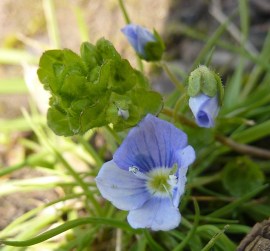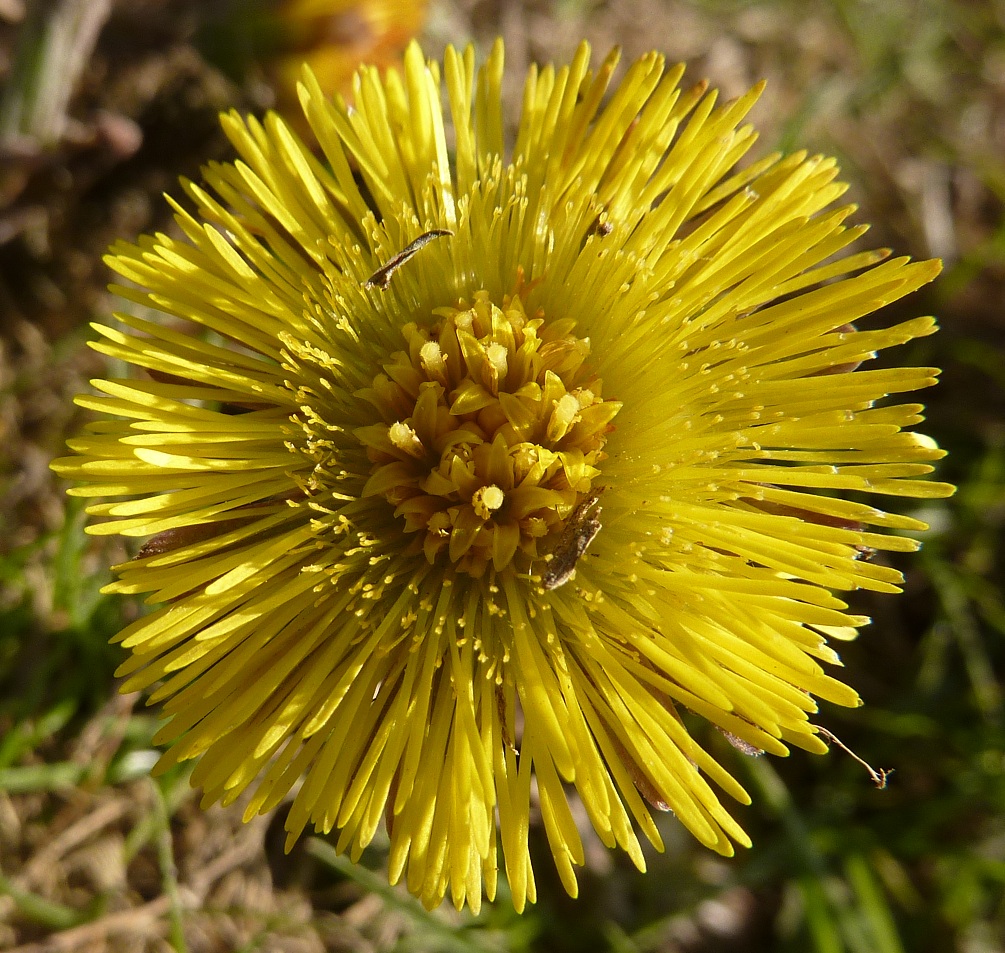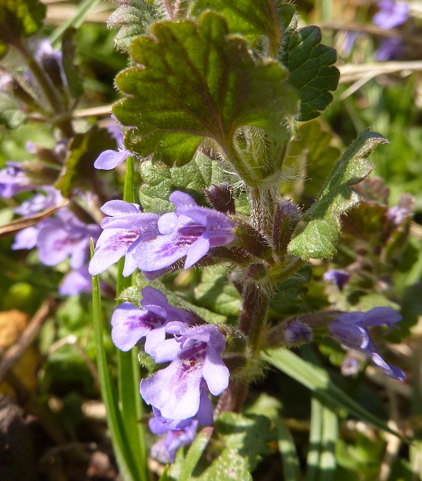 Au bord de l’eau, voilà les jolies fleurs jaunes du tussilage (Tussilago farfara) et le très proche Grand Pétasite (Petasites hybridus..détail d’une fleur), ainsi que deux couvre-sol communs : le lierre terrestre (Glechoma hederacea), aux fleurs violettes et la véronique de Perse (Veronica persica).