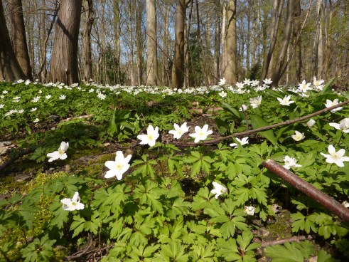 La reine des sous-bois en ce moment, c’est bien sûr l’Anémone sylvie (Anemone nemorosa) qui forme de très jolis tapis. Parfois blanche, parfois rose.