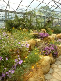 Climbing up the hill, we arrived at the “Alpine Houses”, a small but really nice display showing more fragile alpines, as well as cacti and succulent plants (like this bright pink Delosperma cooperii). Aren’t those colours lovely?