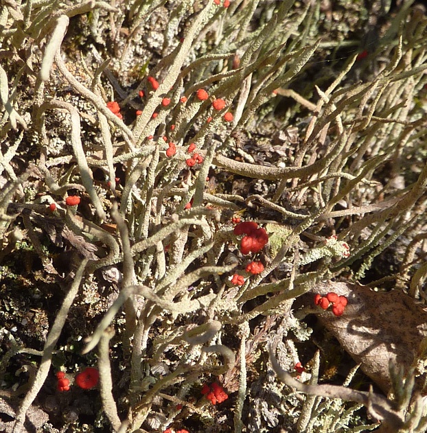 The second one is more enigmatic. I was quite surprised to see these bright red blobs at the tips of lichen branches and wondered what it could be. The lichen here is another species of Cladonia, and the red “caps” are in fact the fruiting bodies of the lichen (containing the spores) called apothecia.