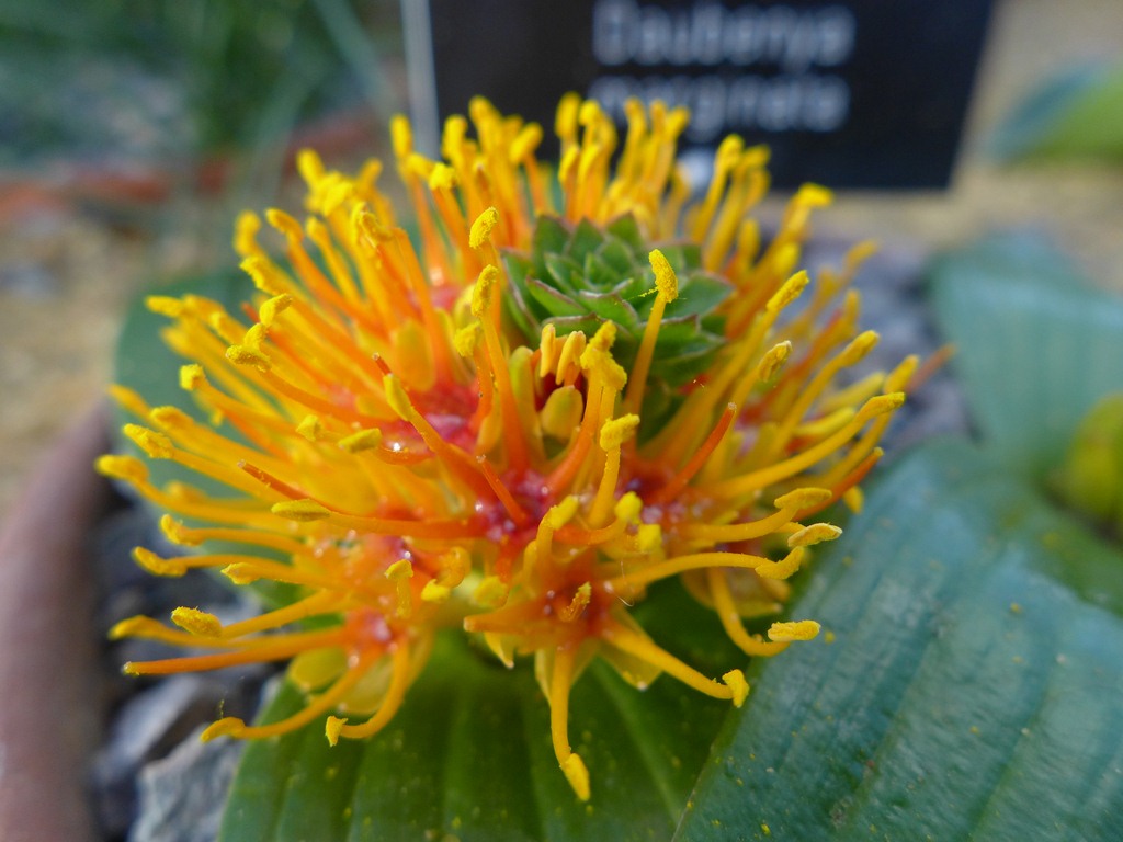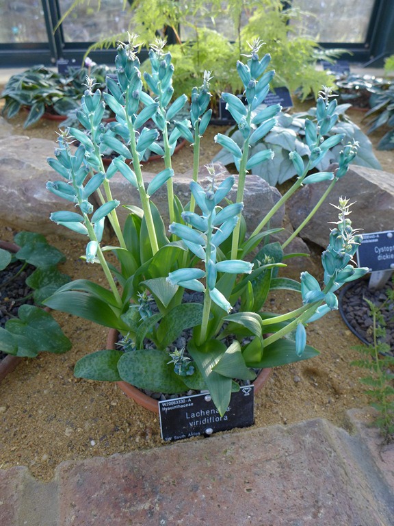 The next stop is the oh-so-lovely Alpine House. Flowering is often short in alpine plants, so every visit to Wisley guarantees new discoveries. Two closely-related bulb species native of South Africa and threatened in the wild : Massonia pustulata (see the pimples on the leaves?) and Daubenya marginata.