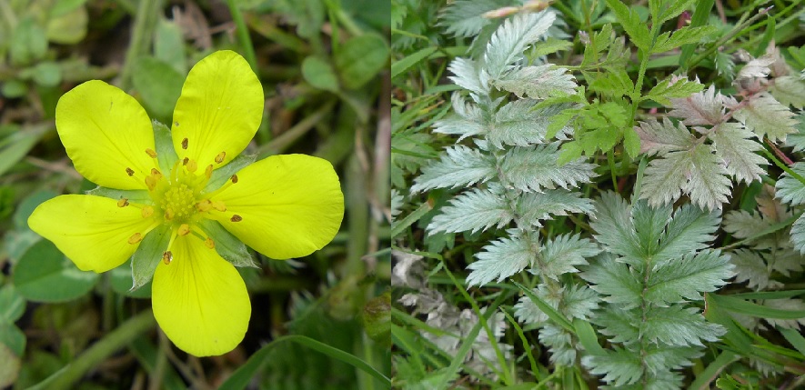 Two low-growing, yellow-flowered plants, belonging to very different families : Creeping Buttercup (Ranunculus repens) and Silverweed (Argentina anserina – it was previously in the genus Potentilla but has been renamed by scientists, don’t ask me why…at least the common name ‘Silverweed’ seems very appropriate!) :