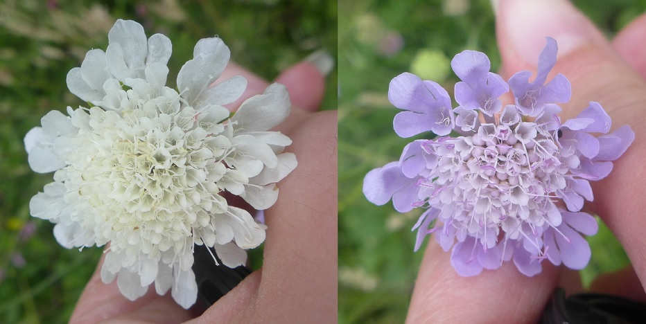 Flower variants are common in these diversified grasslands : this is another example, with blue and white form of the Small Scabious (Scabiosa columbaria) :