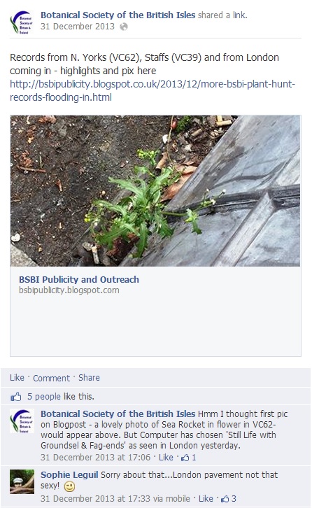Excellent post, Sophie, and glad you like the Publicity Blog! We really enjoyed receiving your images of plants in flower in London over New Year (loved your Groundsel with fag-ends, very “21st century urban botany”!), and it was great seeing botanists use social media to get involved. We are wondering about doing wild plants vs garden plants in flower next year – what do you and your readers think?