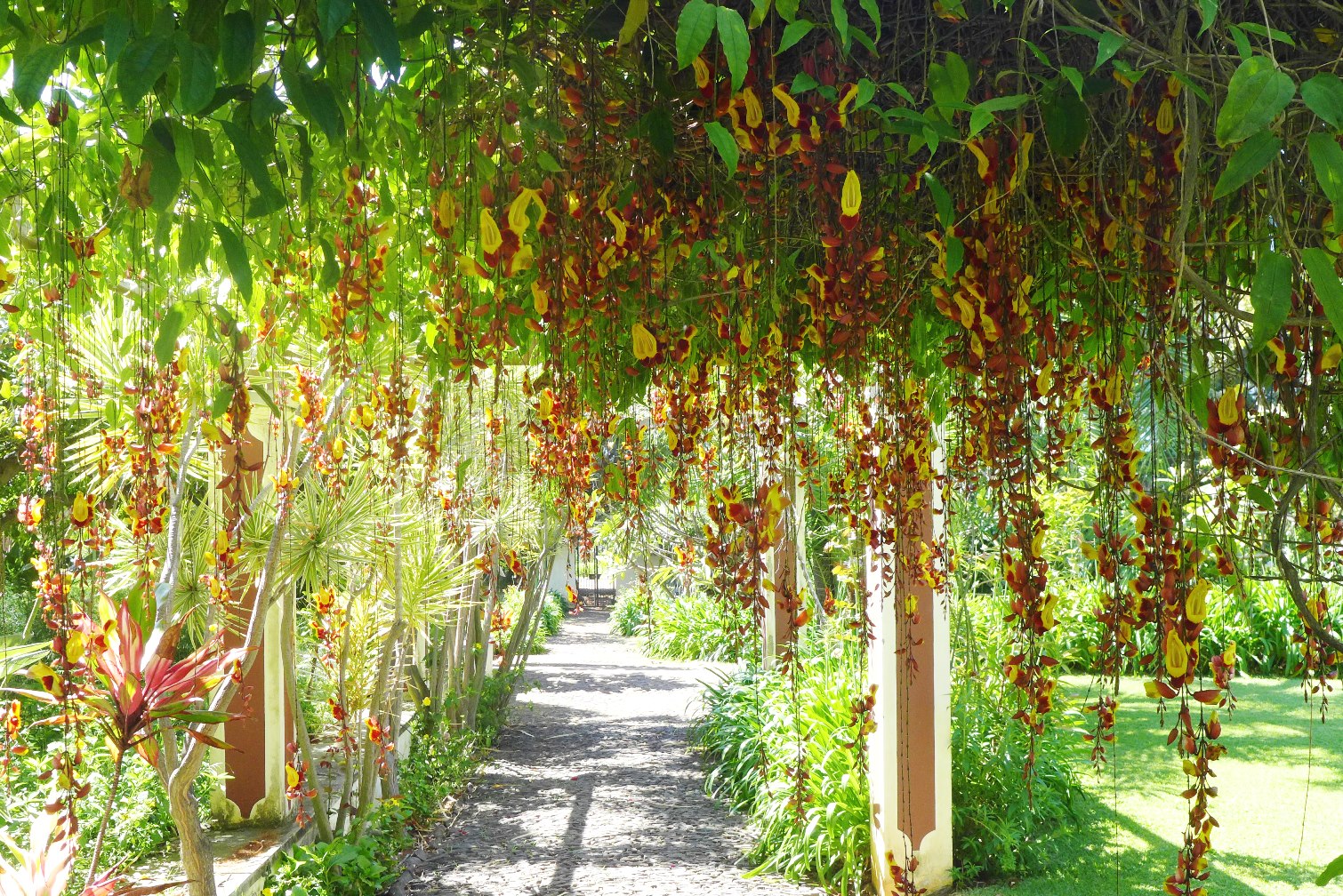 Pathways are covered with pergolas, like this jaw-dropping one covered with Thunbergia mysorensis: