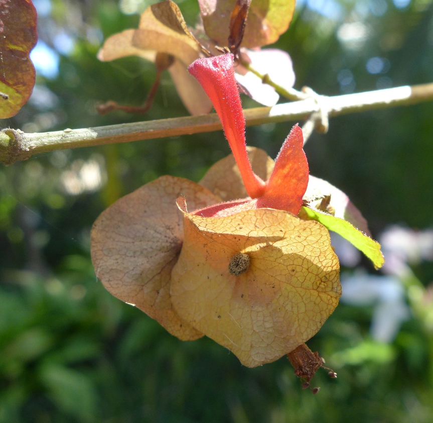 Unusual sightings include the South African tree Schotia brachypetala and the (appropriately named!) cup-and-saucer-plant Holmskioldia sanguinea, an Asian relative of our wild skullcaps (Scutellaria sp.):