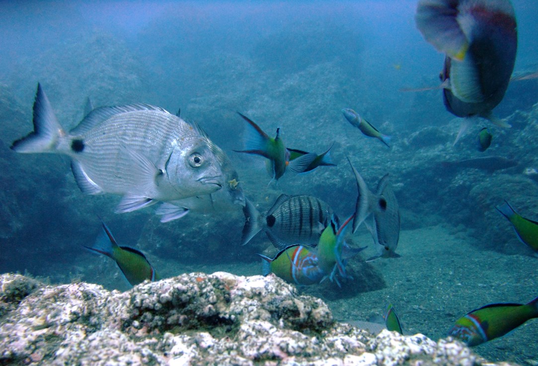In Garajau there is a wide diversity of fishes, from white seabreams (Diplodus sargus) to tropical-looking ornate wrasses (Thalassoma pavo) or parrot fishes. We even saw some barracudas (Sphyraena barracuda) passing above our heads, and a stingray.