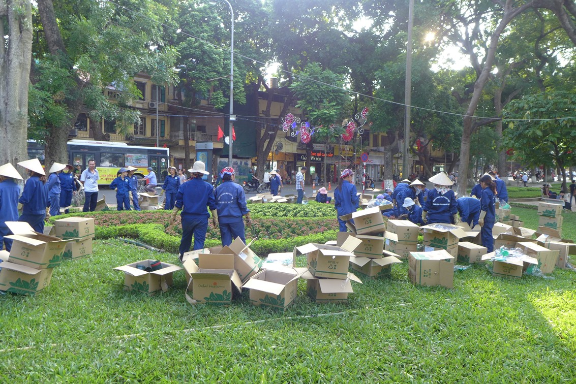 Having visited the surroundings of the lake on our 1st day, where most of the ground under the trees was occupied by tropical grass species, we were quite surprised on the second day to see this scene: dozens of workers in their blue uniforms, digging grass, opening boxes and plastic packaging to unveil hundreds of pots of Anthurium, azaleas, Kalanchoe, Poinsettia and small variegated Schefflera, all coming from China! Horror! We then found out that this was part of the celebrations for the 60th Anniversary of Hanoi’s Liberation.
