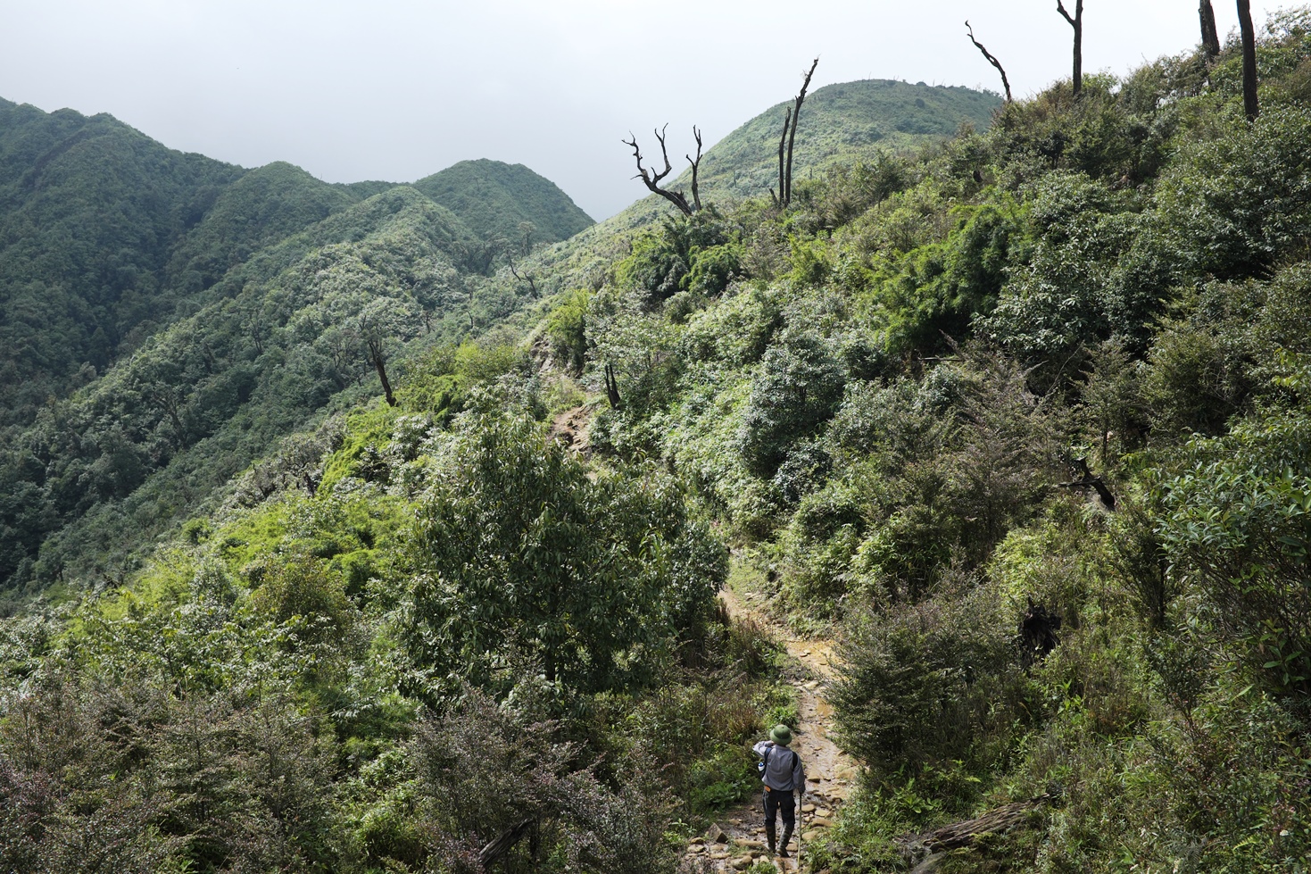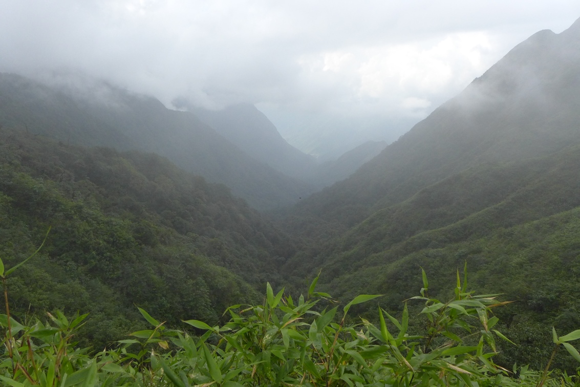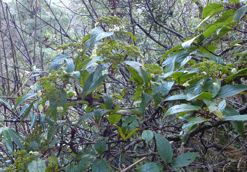 We continue our ascent among bamboos and rhododendrons. Another shrubby plant popular in temperate horticulture is Hydrangea. They seem to be increasingly present around 2500-2700m; I particularly like this one with creamy green flowers: