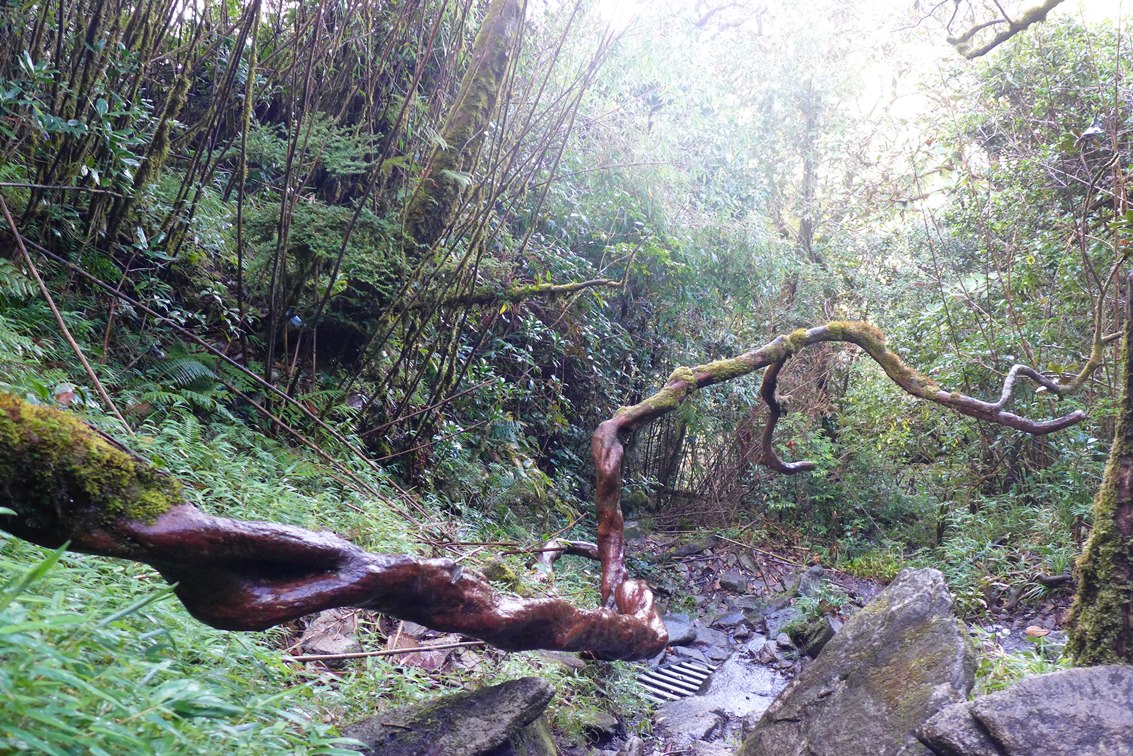 The path becomes a little more challenging, with ladders, wet boulders and Rhododendron trunks taking the most twisted shapes: