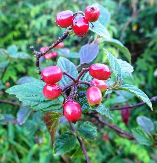 As we climb one last hill, I spot this yet unnamed Clematis with cool purple stems and leaf undersides, and a Viburnum with bright red berries: