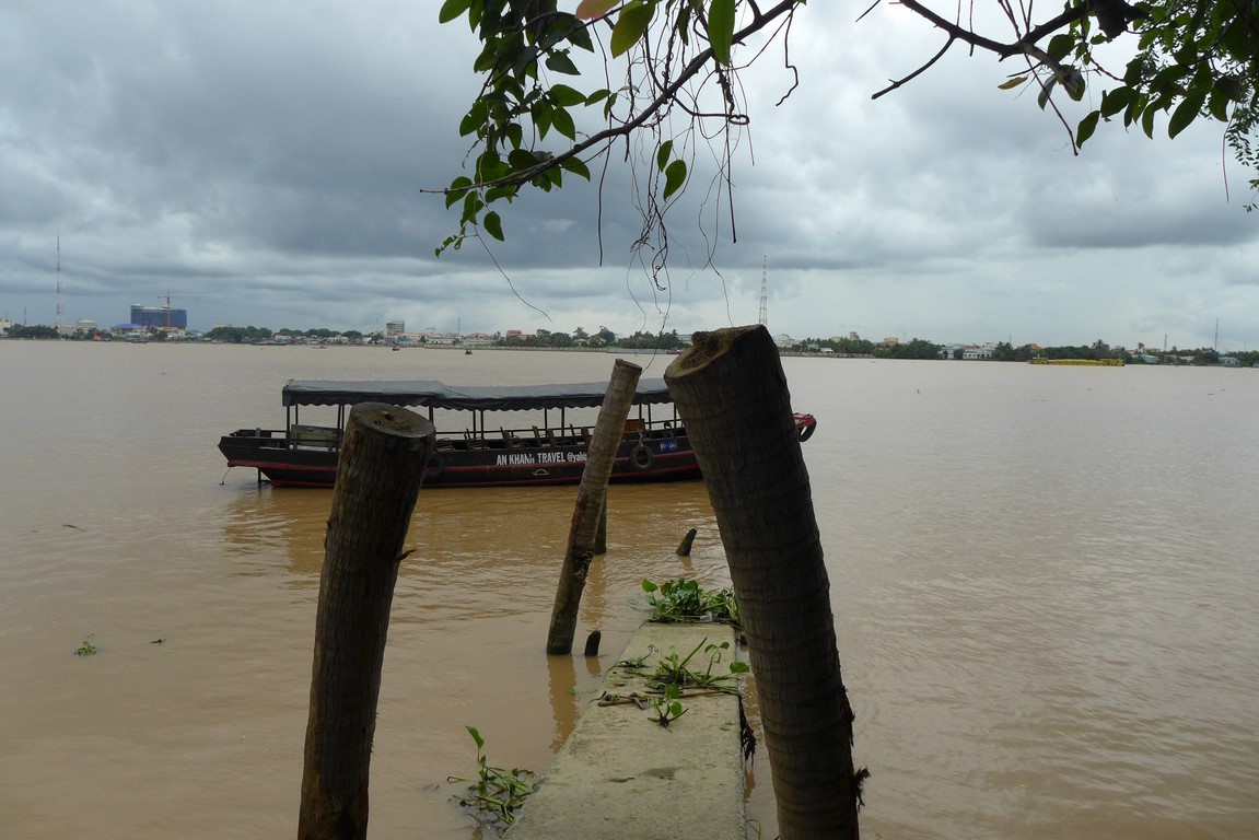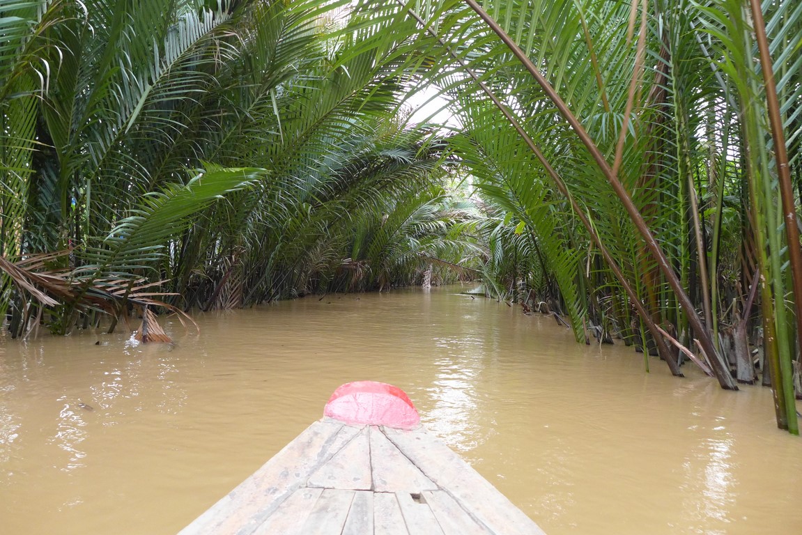 The Mekong river, which rises in Tibet, ends its 4350km course in the South China Sea via a large delta covering over 39000 km², close to Vietnam’s largest city Ho Chi Minh. This means a boat trip to the delta is a very popular day trip for tourists, and we obviously got tempted. The view we got from the boat after a two hour drive wasn’t exactly the most exciting, with dark skies, brownish waters, and industrial estates as surroundings…