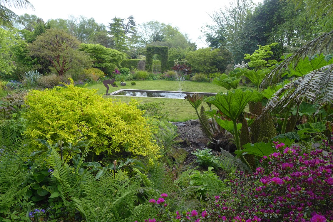 A more formal garden, with huge gunneras and colourful borders: